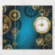 Türkis, strukturiert, Steampunkhintergrund mit Messing- und Goldgetrieben, Silberschlüssel und Uhr. Steampunkstil.