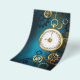 Türkis, strukturiert, Steampunkhintergrund mit Messing- und Goldgetrieben, Silberschlüssel und Uhr. Steampunkstil.