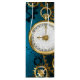 Türkis, strukturiert, Steampunkhintergrund mit Messing- und Goldgetrieben, Silberschlüssel und Uhr. Steampunkstil.