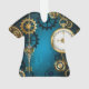 Türkis, strukturiert, Steampunkhintergrund mit Messing- und Goldgetrieben, Silberschlüssel und Uhr. Steampunkstil.