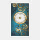 Türkis, strukturiert, Steampunkhintergrund mit Messing- und Goldgetrieben, Silberschlüssel und Uhr. Steampunkstil.