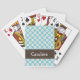 Niedliche Bicycle® Spielkarten Set und Kartenspiel mit türkisfarbenem und hellblauen Polka-Dot-Hintergrund und weißen Farbtönen mit roten Mittelpunkten oben. Dies kann mit Ihrem Namen auf dem schokoladenbraunen PRINTEd gesteppten Band-Design personalisiert werden. Designed by Chrissy H. Studios, LLC. Alle Rechte vorbehalten.