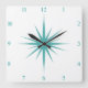 Die moderne quadratische Uhr aus der Mitte des Jahrhunderts besticht durch eine fett türkisblaue atomare Sternexplosion und passende Zahlen, die eine fantastische Ergänzung zu den Wänden Ihrer Zuhause oder Ihres Büros darstellen werden!