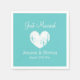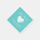Türkisblaue und weiße Servietten für Hochzeitsfeiern. Elegantes Design mit rustikalem Liebe Herz und stilvollem Schriftzeichen-Template. Fügen Sie die Namen der Braut und des Bräutigams sowie das Datum der Ehe hinzu. Trendy Theme, Teil des Set der Zusammenstellung mit der Farbkoordinierung. Schöne Innendekorationen, Accessoires und Party für Ehepaare.