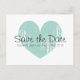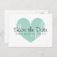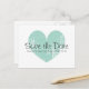Türkisblaues Herz Save the Date Postkarten für Hochzeiten. Vintages, überwittertes Liebe-Symbol mit elegantem Skripttext für Braut- und Bräutigam-Namen plus Datum. Niedliches romantisches Illustrationsdesign personalisiert mit Ihrer Botschaft für Gäste. Anpassbare Hintergrundfarbe ist weiß. Rustikaler Country-Chic-Druck für klassisches Ehe-Party.