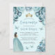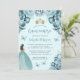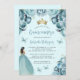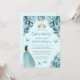 Dieses schöne Quinceañera-Erlebnis besticht durch die türkisfarbenen Blume auf helltürkisfarbenem Hintergrund. Eine Goldtiara, ein dunkelhaariges Mädchen in einem türkisfarbenen Prinzessenkleid und kleine türkisfarbene Schmetterlinge schmücken den Text. Das Wort "Quinceañera" und der Name des Ehrengast erscheinen in eleganter türkisfarbener Schrift, der Rest in grau sans serif Schriftart.