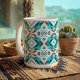 Dieses Design zeichnet sich durch ein geometrisches Muster aus, mit einem sich wiederholenden Motiv aus Diamantformen mit verschwommenen, gefederten Kanten, die nach außen strahlen. Der Gesamteffekt verbindet Symmetrie, Energie und Tiefe - ein Gleichgewicht zwischen Stammesgefühl und moderner Geometrie in Türkis, Grau und Creme.
