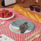 Auf dieser Papiertafel sitzt ein Putengeier auf einem Rettungswache am Quonapaug-See in North Guilford, Connecticut. Ideal für Party und Picknicks.