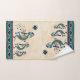Das einzigartige "One of a Kind" Kokopelli Badetuch Set sorgt für eine gelungene Brise im Bad! Es gibt drei türkisfarbene Kokopelli-Tanz im Südwesten und die Flute mit Musiknoten unter der Sonne auf Tan Sandstone Hintergrund ...Umgeben von Südwestgrenzen in Türkis, Weiß und Rost! Dieses Kokopelli Handtuch Set hat einen Matching Duschvorhang und Badematte! Dies ist ein Original Art Design von Künstler Kerry Miller.