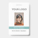 Corporate Style Mitarbeiter Foto ID Abzeichen mit einem einfachen Design. Ihr Firmenlogo ist oben, Ihr Foto oder QR Code ist in der Mitte und unten ist Ihr Name über eine türkisfarbene / aquamarine Band zusammen mit Ihrem Titel darunter. Auf der Rückseite befindet sich ein Vorlagenfeld für optionalen Text, z. B. Ihre Kontaktinformationen. Die Farben von Band und Text können im Entwurfsbearbeitungsprogramm geändert werden.