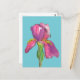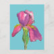 Eine florale Postkarte, die mit einer hübsch rosa und lila Iris-Blume dekoriert ist, in schwarzer Tinte gezeichnet und mit Aquarellfarbe in verschiedenen Rosatönen gestrichen und mit Olivgrün für den Stamm auf türkisblauem Hintergrund lila ist. Sie können die Hintergrundfarbe an Ihre Bedürfnisse anpassen.