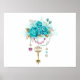 Der goldene alte Schlüssel mit trendigen türkisfarbenen Rose, die mit Blätter aus Weißgold, Rosa und Blau geschmückt sind. Modische Farbe. Türkisfarbene Rose. Weißes Gold. Blaue Krawatte.