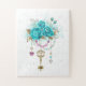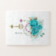 Der goldene alte Schlüssel mit trendigen türkisfarbenen Rose, die mit Blätter aus Weißgold, Rosa und Blau geschmückt sind. Modische Farbe. Türkisfarbene Rose. Weißes Gold. Blaue Krawatte.