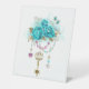 Der goldene alte Schlüssel mit trendigen türkisfarbenen Rose, die mit Blätter aus Weißgold, Rosa und Blau geschmückt sind. Modische Farbe. Türkisfarbene Rose. Weißes Gold. Blaue Krawatte.