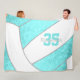 Diese niedliche, abstrakt überdimensionierte Fleecedecke für ihren Volleyballsaal zeigt das Bild eines schlichten, helltürkisfarbenen / aquamarinen und weißen Volleyballs, der die gesamte Decke bedeckt - die türkisfarbenen Volleyballfelder werden mit einem gürtelhaften, kaleidoskopischen Muster vermischt - der Name und die Jerseynummer sind außerhalb der Mitte platziert und in türkisfarbiger Koordination und grau - von katz_d_zynes