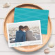 Stilvolle Save the Date Foto-Karte mit dem Foto in einem weißen Rahmen, darunter die Worte "Save the Date" in einem entspannenden kursiven Skript. Die Karte enthält eine aquamarine, türkisfarbene Rückseite mit überlappenden Linien. Personalisieren Sie es, indem Sie den Platzhalter-Text ersetzen und das Foto für die Auswahl/den Platzhalter durch Ihr eigenes Foto ersetzen. Für weitere Optionen klicken Sie auf die Schaltfläche "Anpassen". *Bitte beachten Sie, dass das Zazzle-Wasserzeichen, das in der Zoomvorschau angezeigt wird, NICHT auf dem gedruckten Endprodukt erscheint. © Rosewood and Citrus