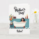 Diese Karte zeigt eine ruhige Badezimmerszene, in der eine Frau mit dunklem, glänzendem Haar in einer weißen Badewanne mit Krallenfüßen liegt, die hoch mit weichen weißen Blasen gefüllt ist. Ihr sanftes Lächeln deutet auf einen stillen, fürsorglichen Moment ❤️. Tealblaue quadratische Fliesen säumen die Wand hinter ihr, und der Boden zeigt ein passendes Teal-weißes Schachbrettmuster, das ordentlich und beruhigend wirkt. Links steht ein kleiner Beistelltisch, auf dem eine klare Glasvase mit frischen Blumen in Orange, Gelb und Hellblau steht, neben einer schlanken Flasche rotem Getränk und einem einzelnen Glas, das darauf wartet, gefüllt zu werden, als ob jemand es für sie dort hingestellt hätte. Darüber sitzt ein kleiner retro-style Musikplayer in der Nähe, der die gemütliche, entspannte Stimmung noch verstärkt. Rechts brennen zwei Kerzen in dekorativen Haltern unterschiedlicher Höhe in warmem Gold und werfen ein weiches Licht, das die Szene zart und gepflegt erscheinen lässt 🌼. Oben erscheint der Satz „Es ist Muttertag