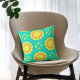 Lebhaftes Kissendesign mit einem nahtlosen Muster aus geometrischen Formen in orange und gelb auf türkisfarbenem Hintergrund.