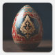 An ornate Easter egg placed on a dark wooden surface. The egg is richly decorated with intricate patterns in red, blue, and gold, with a prominent central motif resembling a stylized floral or flame design.