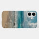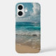 Eine ruhige tropische Ozeanszene mit türkisblauen Wellen, die sanft auf einen Sandstrand unter einem hellblauen Himmel mit flauschigen Wolken rollen. Ein weit entferntes Segelboot schwimmt am Horizont und schafft eine ruhige und erfrischende Sommeratmosphäre, perfekt für Telefonzellen.