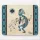 Dies ist ein einzigartiges "One of a Kind" Südwest Kokopelli Mouse Pad! Es ist ein türkisfarbenes Kokopelli im Südwesten von Kokopelli, das die Flute spielt und unter der Sonne tanzt, auf einem Tan Sandstein Hintergrund, umgeben von einer Südwestgrenze in Türkis, Weiß und Rost..mit Musiknoten! Original Art Design von Künstler Kerry Miller.
