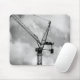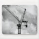 ein drastisches Schwarzweiss-Foto eines Turmkrans gegen einen bewölkten Sommerhimmel.