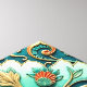 A turquoise and orange floral ornament with a golden frame, intricate details, symmetrical design, ornate swirls, vintage style, decorative elements, elegant composition, and a dark blue background.