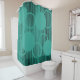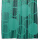 Dieser Duschvorhang hat ein modernes Design aus schwarzen senkrechten Linien, dessen Kreise auf einem türkisfarbenen Feld verstreut sind.