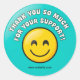 Cheerful, punchy, and brand-ready — this editable thank you business sticker pairs a bright turquoise backdrop with a bold white message: “THANK YOU SO MUCH FOR YOUR SUPPORT!” and a friendly smiley face centerpiece. Add your website URL, upload your logo, and tailor the note to thank you for your order or thank you for your business for repeat buyers. Perfect for small business owners who want cohesive online shop packaging, handmade business packaging, and polished ecommerce packaging with personality.