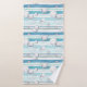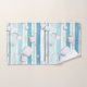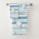 Watercolor painted stripes in blue, turquoise and aqua tones on a white background with hand drawn sea shells and bubbles on them.
