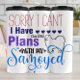 Diese spielerische Grafik humorvoll Staaten, "SORRY I CAN I not have ... Pläne mit meinem Samoyed". Eine bezaubernde Silhouette mit weißem Samoyed Hund begleitet den lebendigen, mehrfarbigen Text und blauen Herzakzenten. Es ist ein perfektes Design für jeden Hundeliebhaber, der mit seinem flauschigen Hundebegleiter auf komische Weise wertvolle Zeit priorisiert.