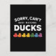 Dieses spielerische Design enthält eine Reihe von bunten Gummienten und den humorvollen Text "Sorry, ich kann nicht, ich bin beschäftigt, Ducks zu beobachten." Ideal für Entenliebhaber, für diejenigen, die ein sonderbares Gefühl des Spaßes genießen, oder für alle, die eine gute Ausrede für die Vermeidung von Verantwortung Lieben. Es ist ein lustiges und leichtes Design, das jedem, der es sieht, ein Lächeln bringen wird. Ideal für lässige Kleidung oder als Geschenk für die Person, die immer von bezaubernden Gummienten abgelenkt wird!