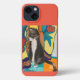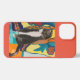 Tuxedo-Katze und mehrfarbige, bestickte Fenstervorhänge mit orangefarbenem Hintergrund