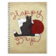 Eine niedliche, schwarz-weiße Tuxedokatze lehnt sich auf eine große rote Garnkugel. Die Worte "Happy Days" sind mit dem Garn geschrieben. Original Design ist von Christie Black von Kreationen aus dem Herzen.
