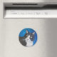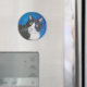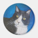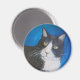 Porträtmalerei einer schwarz-weißen Tuxedokatze mit gelben Augen. Die Katze steht dem Betrachter gegenüber, der in einer Pose einer Katze in einem Regal leicht nach einer Seite schaut. Das Tierportrait der Katze wird vor einem königsblauen Hintergrund hervorgehoben. Passen Sie diesen coolen Katzenkunst-Portraitmagneten mit Ihren eigenen personalisierten Texten und Bildern an, um besondere Katzenliebhaber-Geschenke zu machen!