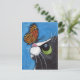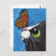 Whimsical Katzenkunst Postkarte. Eine grüne mit Augen, schwarz-weiße Katze mit einem schönen orangefarbenen Vikeroy-Schmetterling auf der Nase. Aus einem Originalgemälde 2009 entworfen, ist Lisa Marie Robinson