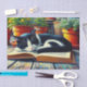 Dekoriertes Papiertaschentuch mit einer Tuxedo Katze, die auf einem Buch in einem Garten schläft. Ideal, um Ihren handwerklichen Projekten eine charmante und skurrile Touch mit diesem reizvollen, naturlich inspirierten Design zu verleihen.