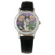 Tuxedo Katze sitzt auf einem Gartenstuhl mit Blume Armbanduhr
