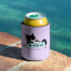 Niedliches, schwarz-weißes Tuxedo Kätzchen, das in einer blauen Hundeschale vor einem Hintergrund von lila sitzt.