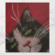 niedliche, schwarz-weiße Tuxedokatze mit leuchtend grünen Augen sitzt auf einem tiefroten Hintergrund in diesem Gemälde hergestellt Weinetikett. Denn was geht besser als Katzen und Wein.