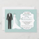 Diese moderne Einladung kennzeichnet das schwarzes Smoking eines Bräutigams und Hochzeitskleid der weißen Braut auf einem Aquamarinehintergrund. Sie können dieses verwenden einladen für wedding Mitteilungen, Verlobungs-Party Einladungen Save the Date Probenabendessen- oder weddingmittagesseneinladungen.