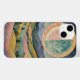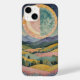Das ist ein skurriles und symbolisches Landschaftsbild mit einem weiten, sanften Hügel unter einem Himmel. Die Hügel werden in einer Reihe von fegenden, gewellten Linien und einer abgestuften Palette von Grüntönen, Gelben, Blues und weichen Pinks dargestellt, was auf ein fruchtbares, traumhaftes Gelände hindeutet. Der Vordergrund ist mit einer Vielzahl von stilisierten Pflanze und Blume gefüllt. Die Dominierung des Himmels ist eine große, zentrale Leiche, die ein Himmelsgesicht darstellt, geteilt zwischen einem menschenähnlichen Profil und einem geometrischen, mosaikähnlichen Muster. Der Himmel oben ist ein tiefes Indigo, mit goldenen Sternen übersät, mit einem Vollmond, der rechts sichtbar ist. Der Stil ist sehr dekorativ und folkloristisch, mit einem Sinn für kosmische Harmonie und Naturwunder.