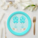 Kreative Zwillingsjungen duschen Teller mit niedlichen Jungenzwillingen unter Blumensträußen.