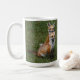 Ein rotes Fuchspaar sitzt nah zusammen auf einem Feld am Waldrand.