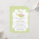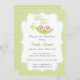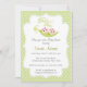 Babydusche Einladung mit Erbsen in einem Design für Zwillingsmädchen. Der Hintergrund ist ein schöner grüner Punkt.