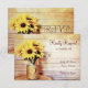 Die Hochzeitskarten sind perfekt für Hochzeitsfeiern im Landhausstil mit Sonnenblumen in ihren blumengeschmückten Hochzeitsarrangements. Die Maurerkirsche liegt vor einem rustikalen Holzboden. Es hat auch ein rustikales Holzherz an der Vorderseite des Maurerkirsches.