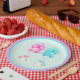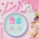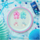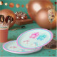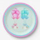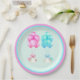 Creative Baby Duschdusche Teller mit zwei Jungen und einem Mädchen unter den Bouquets aus rosa und blauen Ballons.