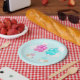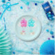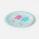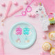 Niedlichen Zwillinge duschen Teller mit Mädchen und Jungen, die zwei Babys unter einem Blumenstrauß aus rosa und blauen Ballons sehen.