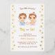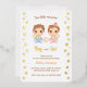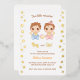 Cute cartoon babies, boy and girl, in blue and pink rompers and yellow bibs holding matching rattles. Lovely and original baby shower invitation.