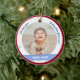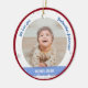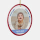 Trendy, elegant und niedlich personalisiertes First Christmas Baby Ornament für zwei kleine Jungs für eine Patchmutter mit einem weißen Rahmen mit Schneeflocken und Sternen, die eine runde Öffnung für ein maßgeschneidertes horizontales Foto hat, und einer gekrümmten blauen Band auf jeder Seite, auf der der Name oder die Namen der Zwillinge in einem eleganten Drehbuch Schriftart / Typografie erscheint. Dieses Design beinhaltet auf der Vorderseite die Worte "Wir Liebe dich, Godmutter Johanna!", die du personalisieren oder löschen kannst. Auf der Rückseite ist ein eigener Text für das Jahr des ersten Weihnachtsgeschehens der Babys. Mit einem äußeren, roten Rahmen von Xmas.